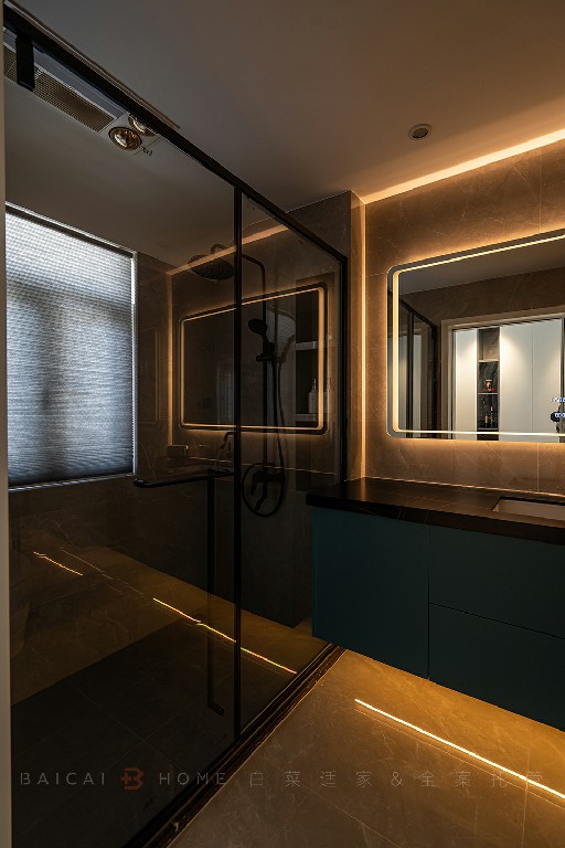 洗手柜下设置感应灯,夜晚起夜更安全。有灯带的镜子氛围感直接拉满!