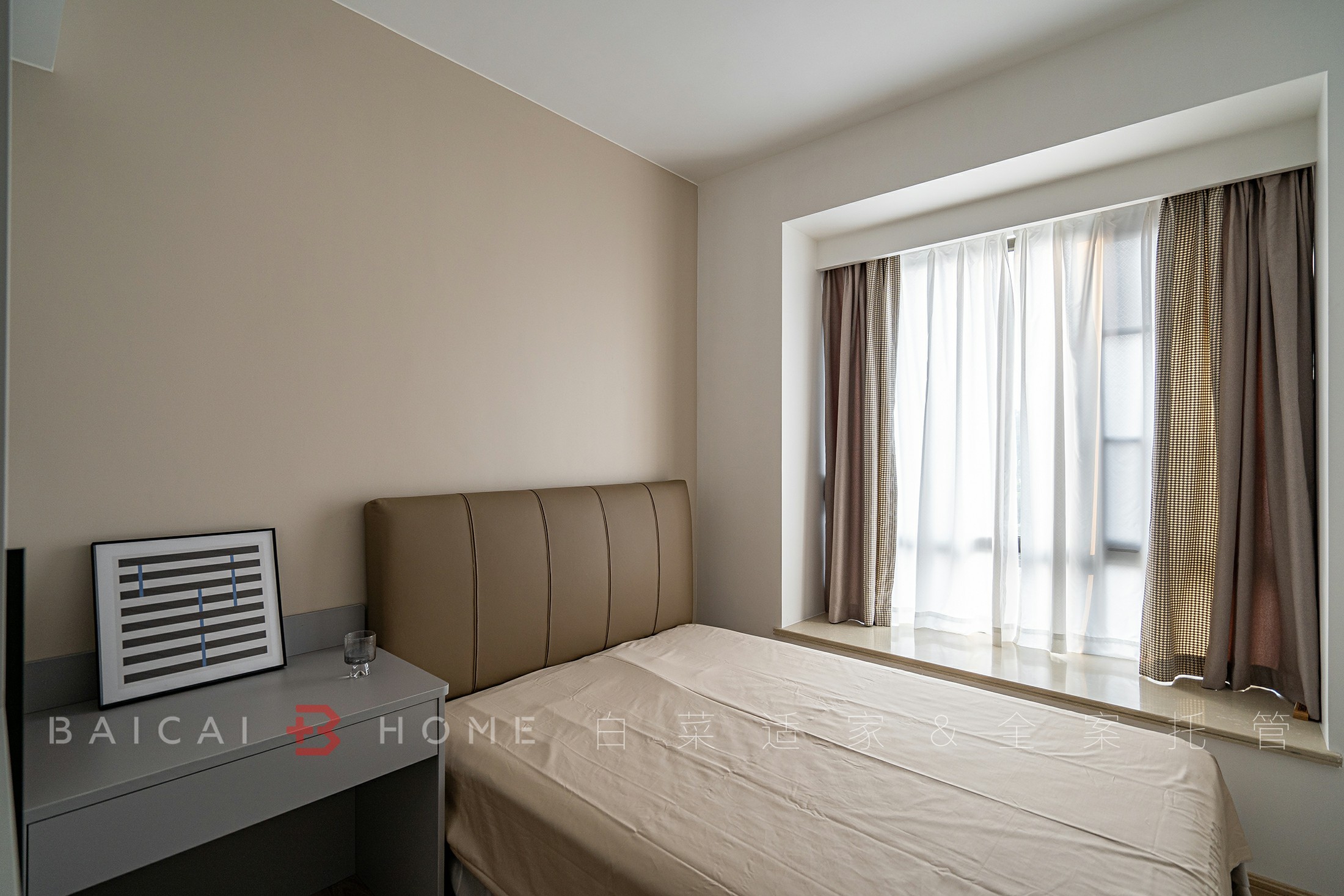 明朗的线条与色调,注重呈现视觉空间的美学要素。背景墙开出的局部收纳格,不仅拓展了床头的收纳空间,更是视觉层次感的体现。