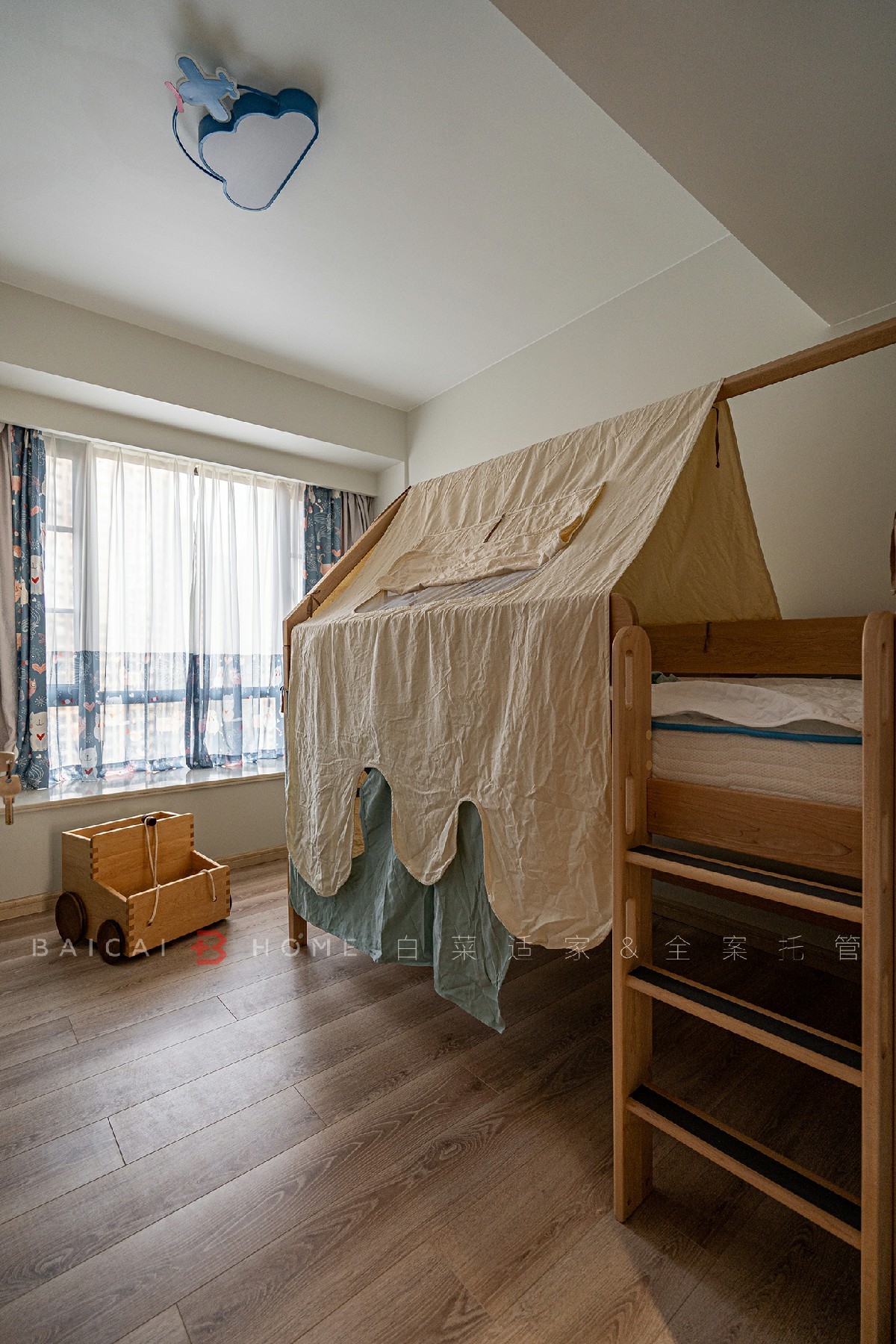 木地板通铺,在室内光脚玩耍也不会受凉,用巧妙设计,给孩子一个自由且充满童趣感的童年。